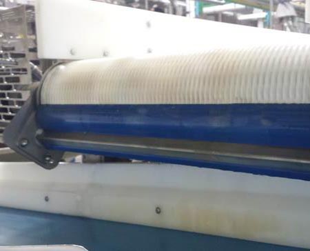 The ground meat was being transferred on a ¾" (20 mm) pitch modular plastic belt positioned at an incline of approximately 30 degrees. A fixed scraper was not an option because of the uneven surface of the belting links as they flexed around the drive sprockets. The maintenance team was, however, able to install a Flexco FGP Food Grade Precleaner at the discharge end of the conveyor, right at the dump zone. The blade tensioning feature of the FGP allowed them to run the cleaner on the plastic modular belt with the blade contouring to the uneven surface.